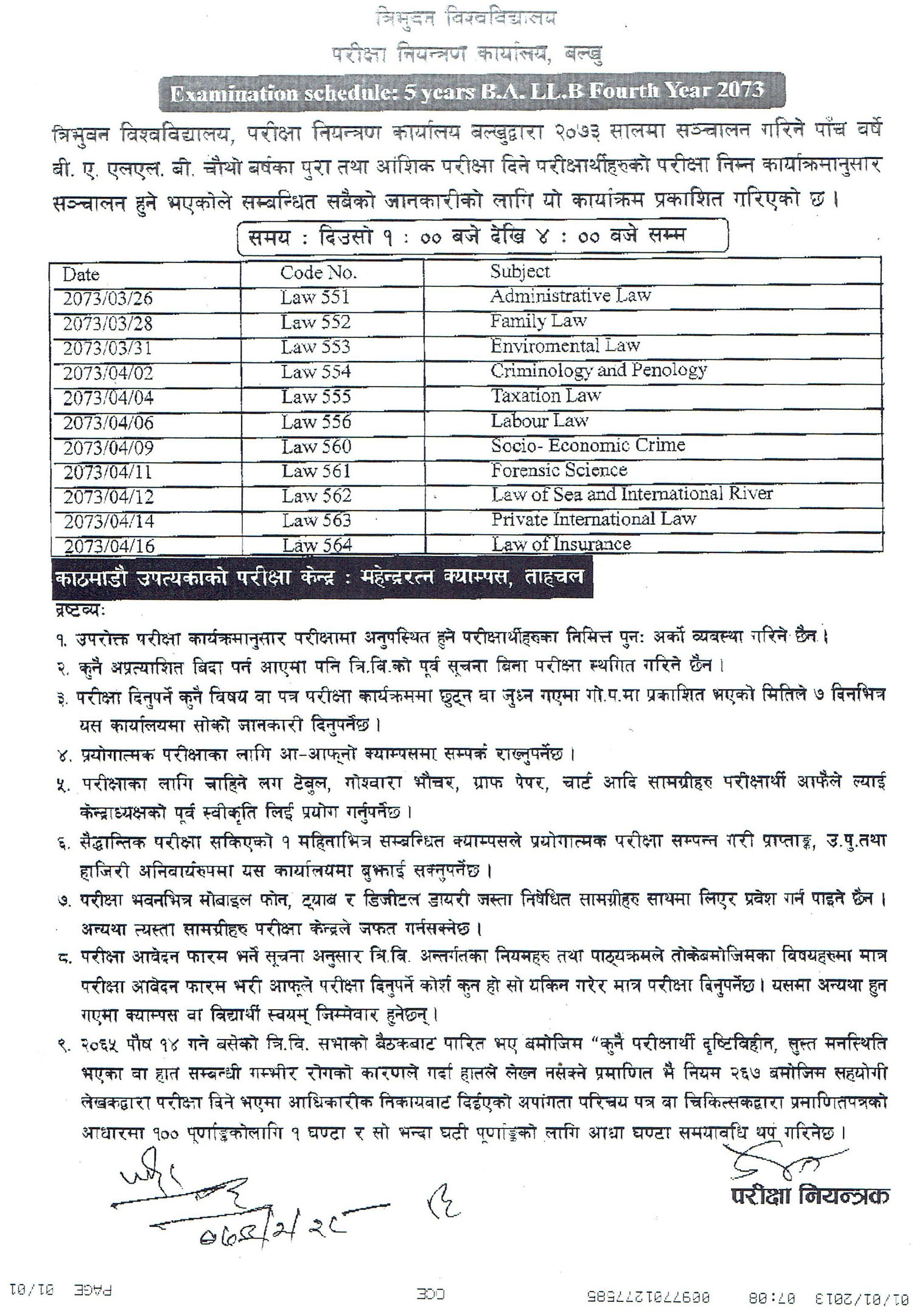 Examination Schedule : 5 Years B.A. LL.B Fourth Year 2073