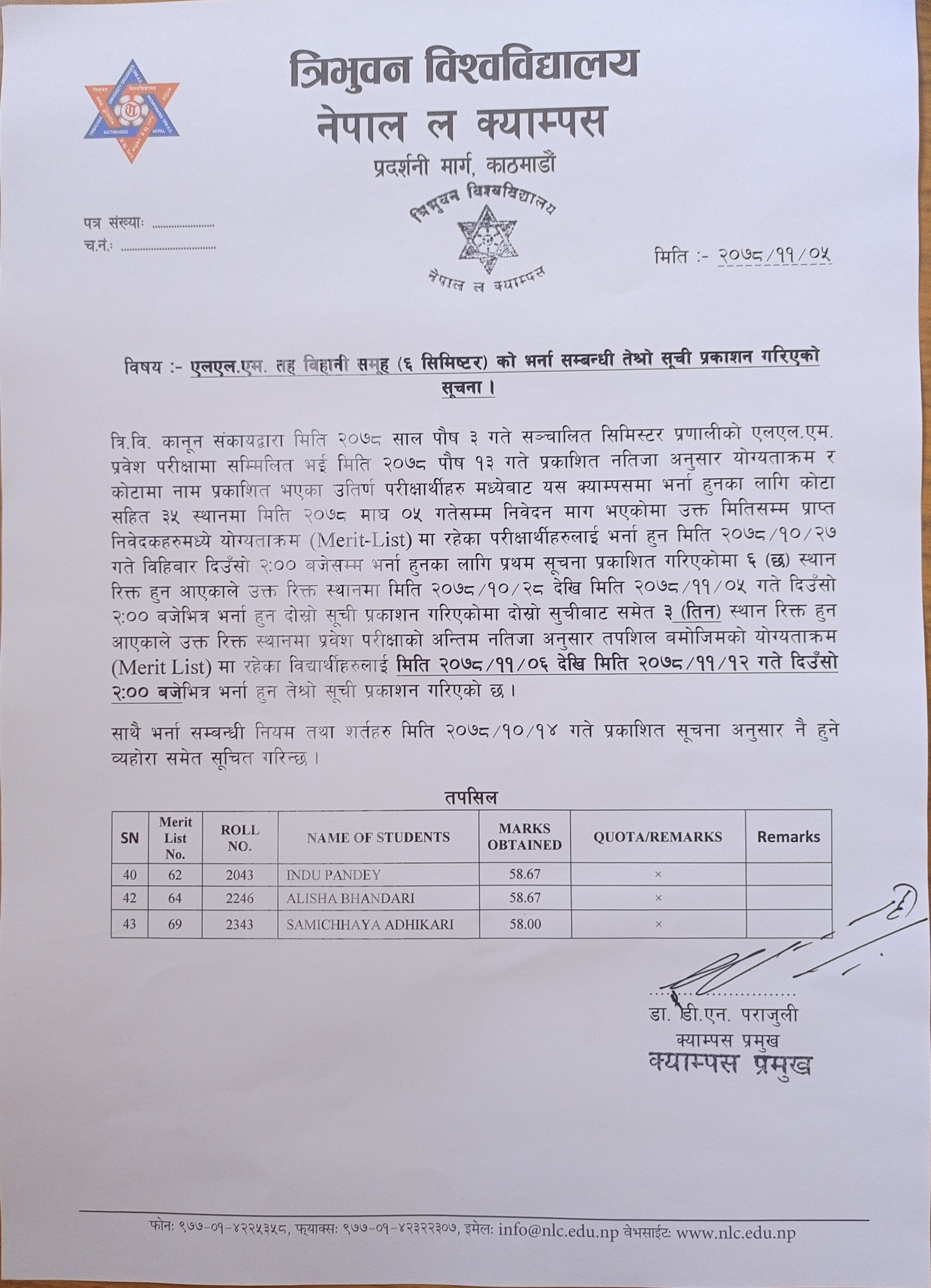 Published Date: 2022-02-17 एलएल.एम. तह विहानी समुह (६ semester) को भर्ना सम्बन्धी तेश्रो सुची प्रकाशन गरिएको सुचना हेर्न यहाँ click गर्नुहोस |