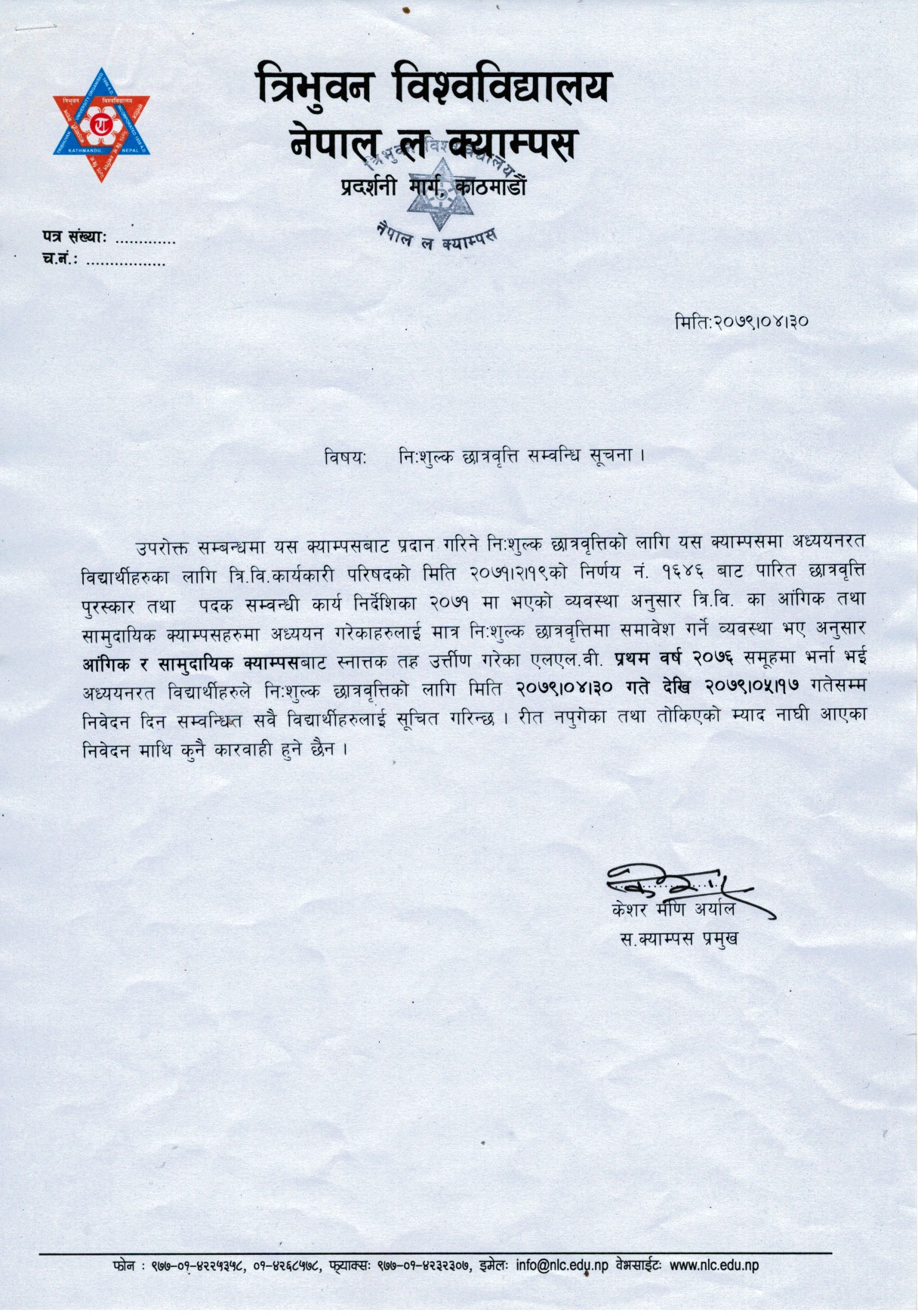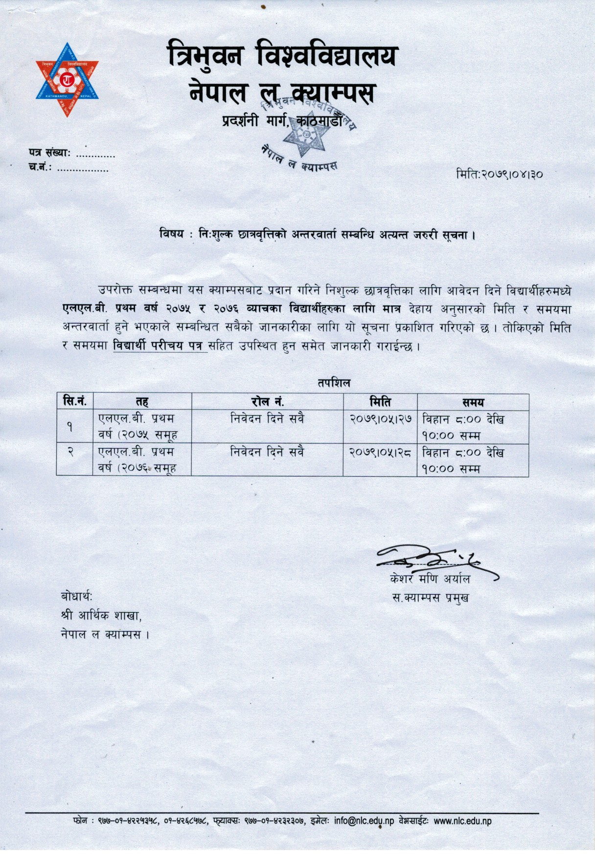निशुल्क छात्रवृत्ति (एलएल.बी. तह प्रथम वर्ष २०७६ समूह) सम्बन्धि सूचना हेर्न यहाँ Click गर्नुहोस् ।