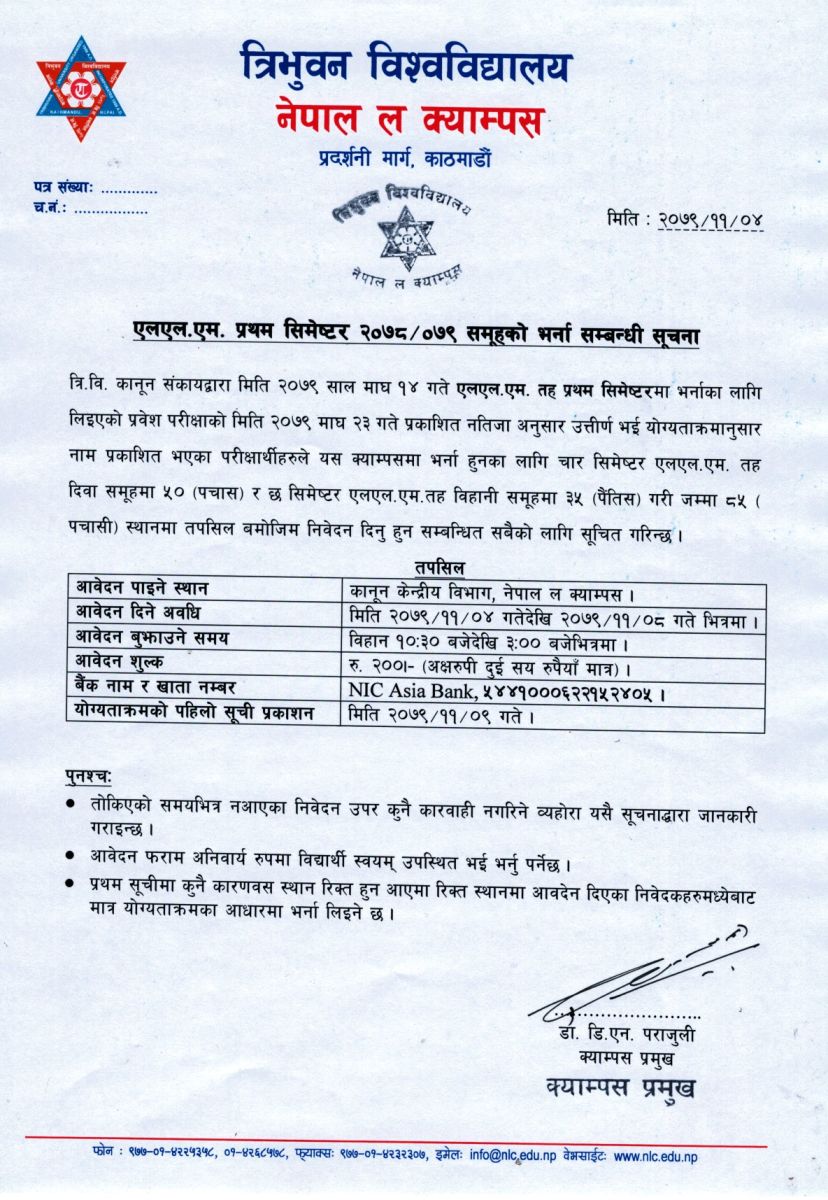 Published Date: 2023-02-16 एलएल.एम. प्रथम सिमेष्टर २०७८/०७९ समूहको भर्ना सम्बन्धी सूचना हेर्न यहाँ Click गर्नुहोस् ।