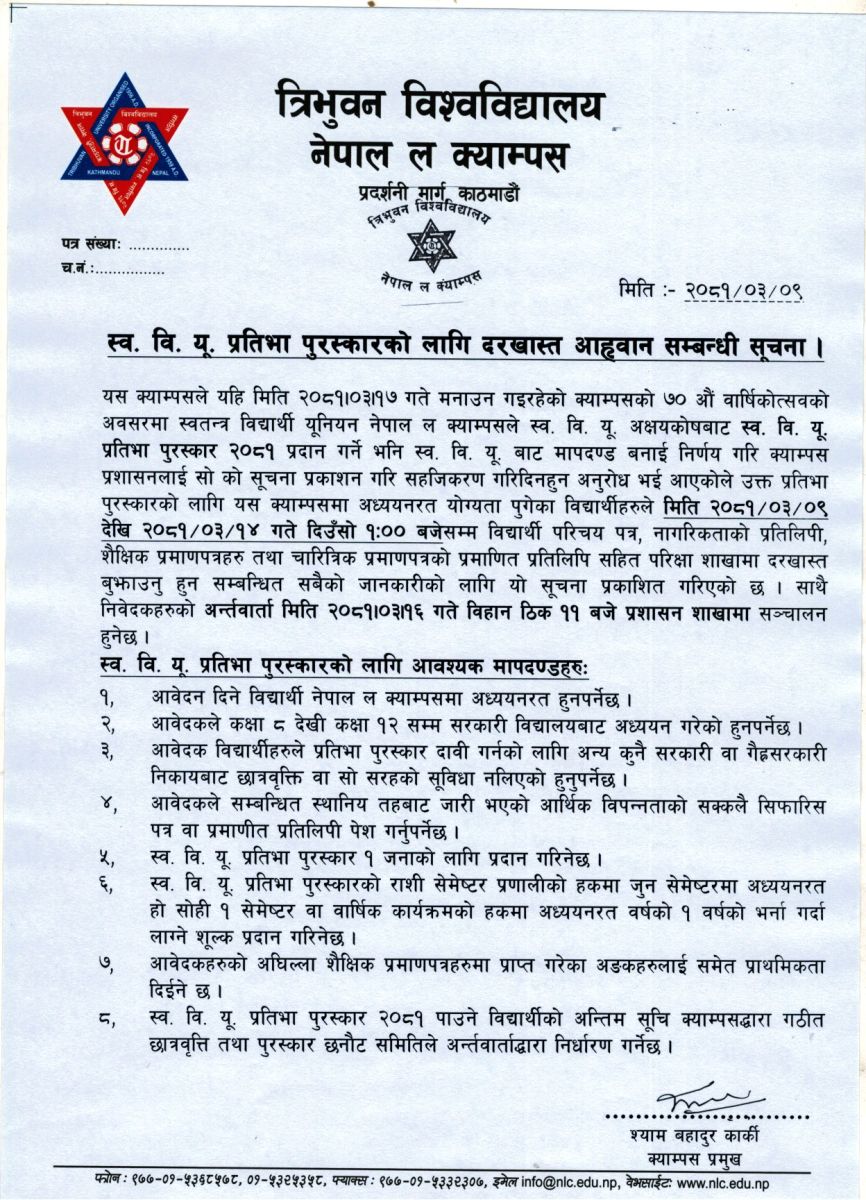 स्व. वि. यू. प्रतिभा पुरस्कारको लागि दरखास्त आह्वान सम्बन्धी सूचना ।