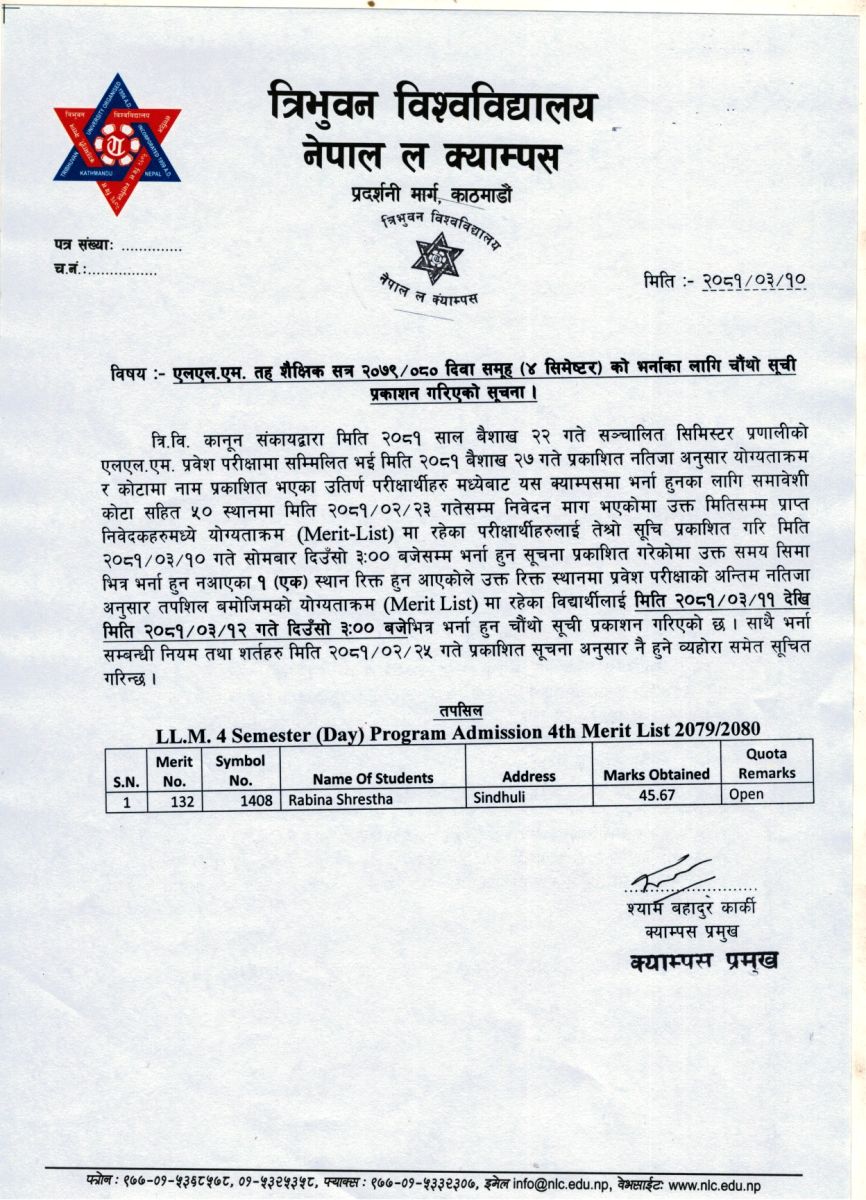 एलएल.एम. तह शैक्षिक सत्र २०७९/०८० दिवा समूह (४ सिमेष्टर) को भर्नाका लागि चौंथो सूची प्रकाशन गरिएको सूचना ।