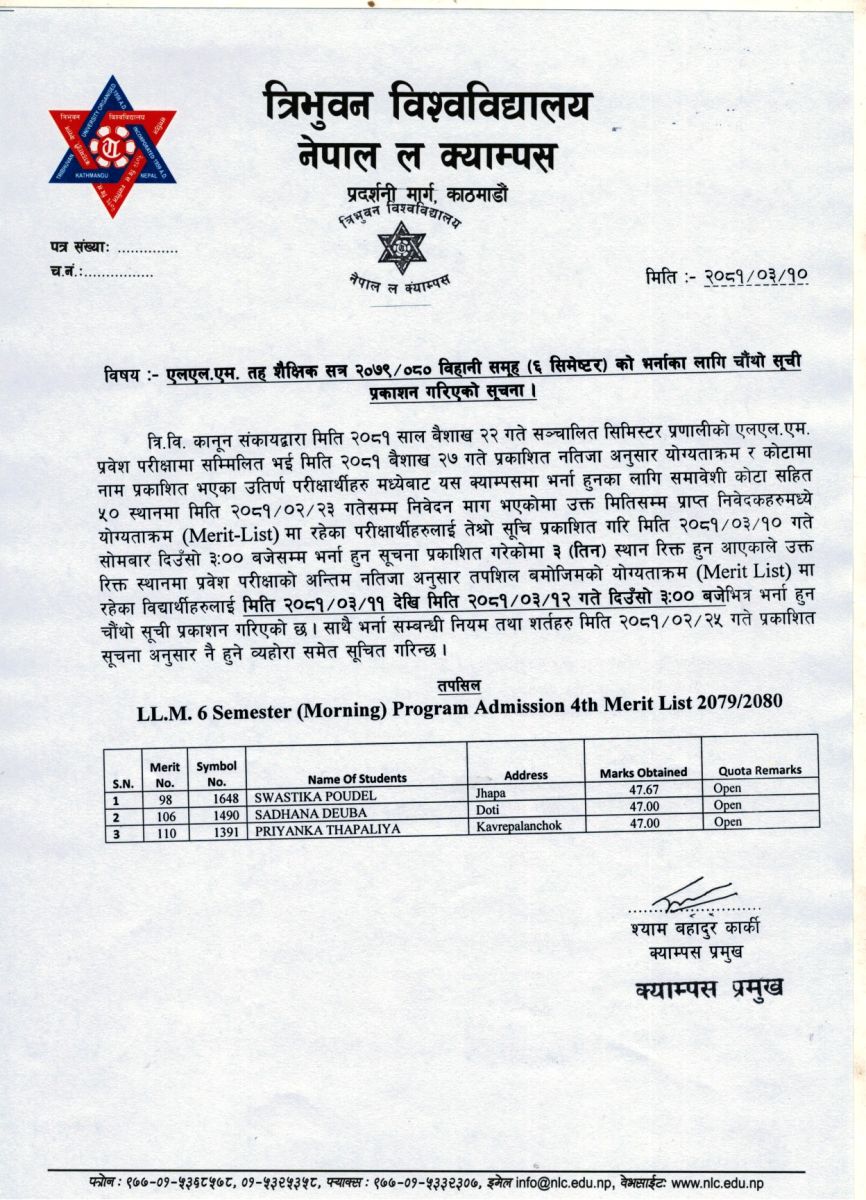 एलएल.एम. तह शैक्षिक सत्र २०७९/०८० विहानी समूह (६ सिमेष्टर) को भर्नाका लागि चौंथो सूची प्रकाशन गरिएको सूचना ।