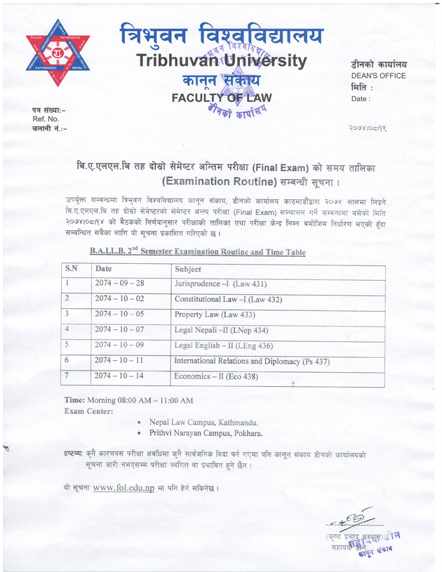 B.A.LL.B 2nd Semester Examination Routine and Time Table