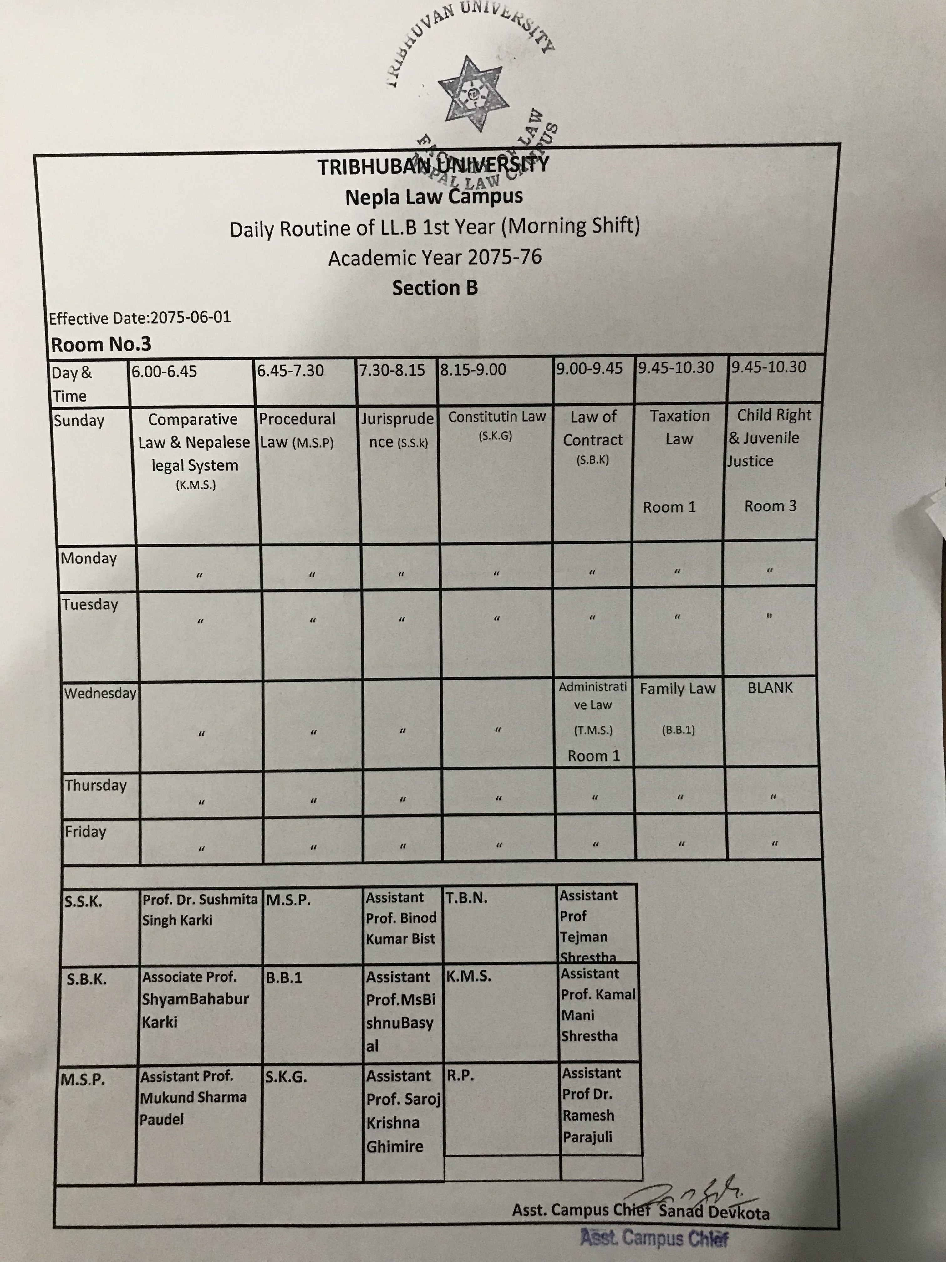 Daily Routine LL.B First Year(Section B)